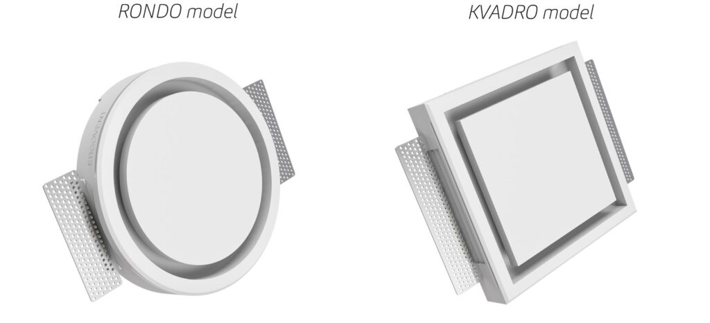 Prezračevalni difuzorji ERGOVENT so izdelani iz mavca. Enostavna vgradnja v strop iz suhomontažnih plošč, nato pa se lahko obdela in pobarva z enako barvo kot strop. Vidna ostane le minimalna reža za pretok zraka.
