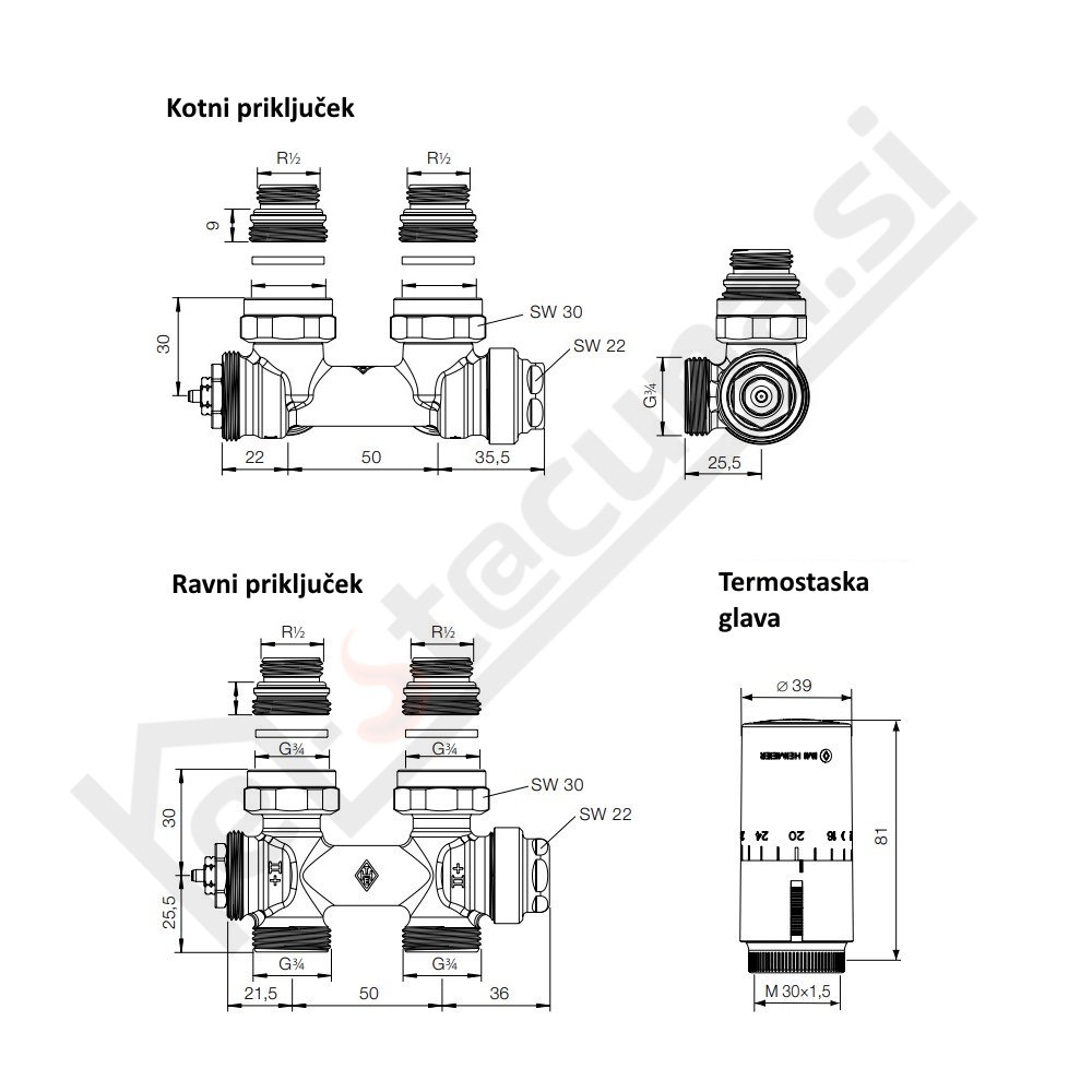 Radiatorski ventil s termostatsko glavo. Uporablja se za priklop kopalniških radiatorjev. Komplet je zasnovan za vse vrste radiatorjev z razmikom priključkov 50 mm.