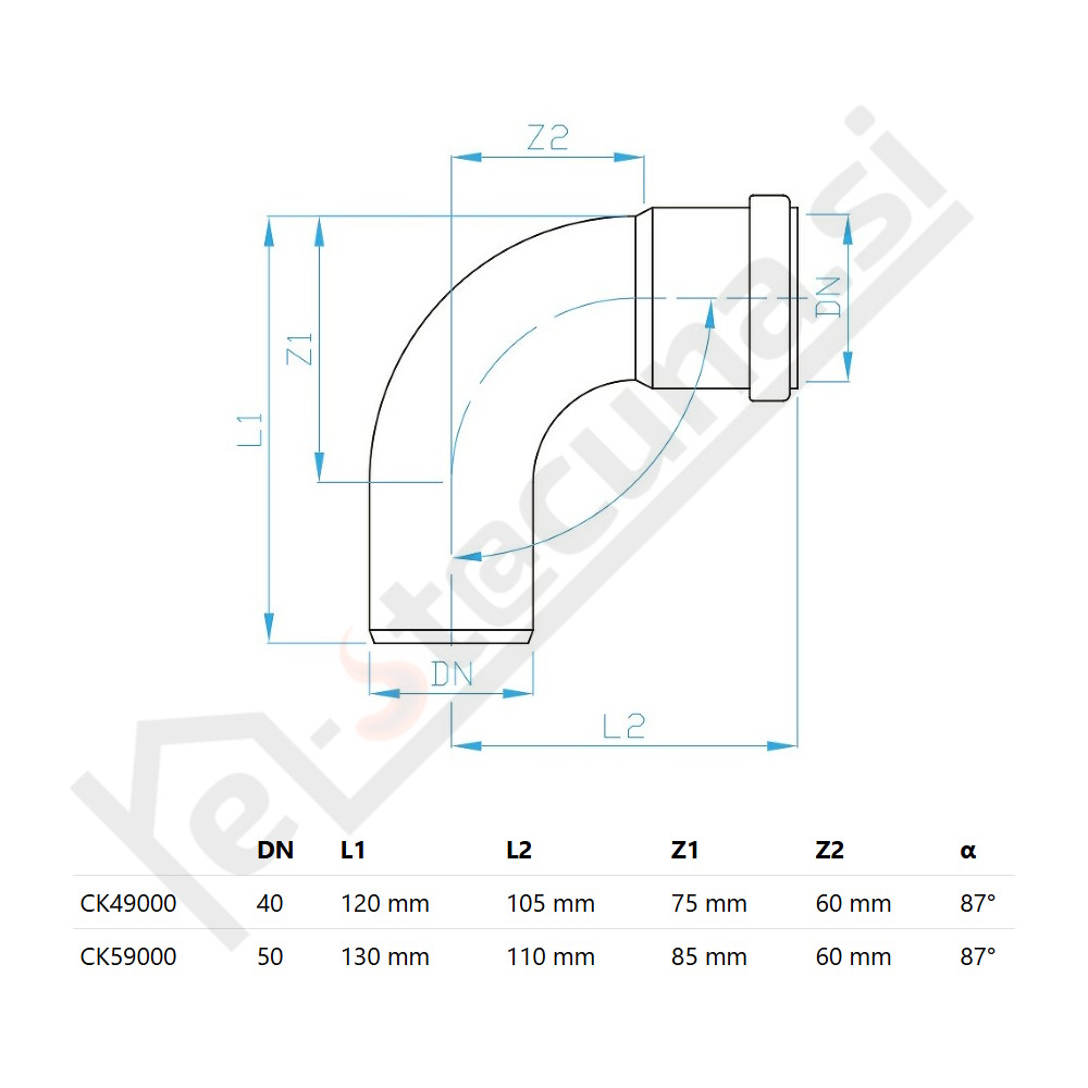 PlastBrno CK koleno 87°, dolgi lok (DN40 / DN50)