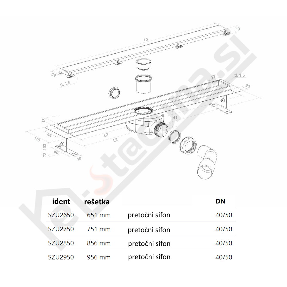 Odtočni kanal je na voljo v dolžinah od 651 mm do 956 mm, kar omogoča prilagajanje vašim potrebam. Odtok ima pretok 52L/min, kar bo zagotovilo hitro in učinkovito odtekanje vode.
