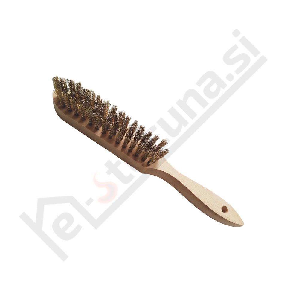 Žična ščetka z lesenim ročajem in medeninastimi ščetinami, namenjena za čiščenje in pripravo občutljivih površin.