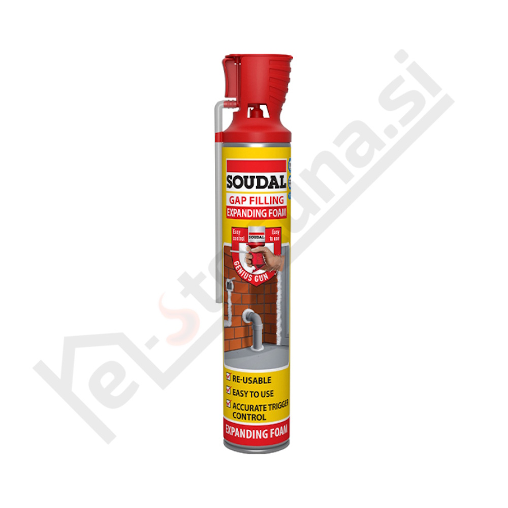Soudal Soudafoam Genius 750 ml je enokomponentna samorazširljiva poliuretanska pena, namenjena ročni uporabi brez montažne pištole. Opremljena je s patentiranim sistemom Genius Gun, ki omogoča natančen nanos ter večkratno uporabo tudi po delni porabi pločevinke.