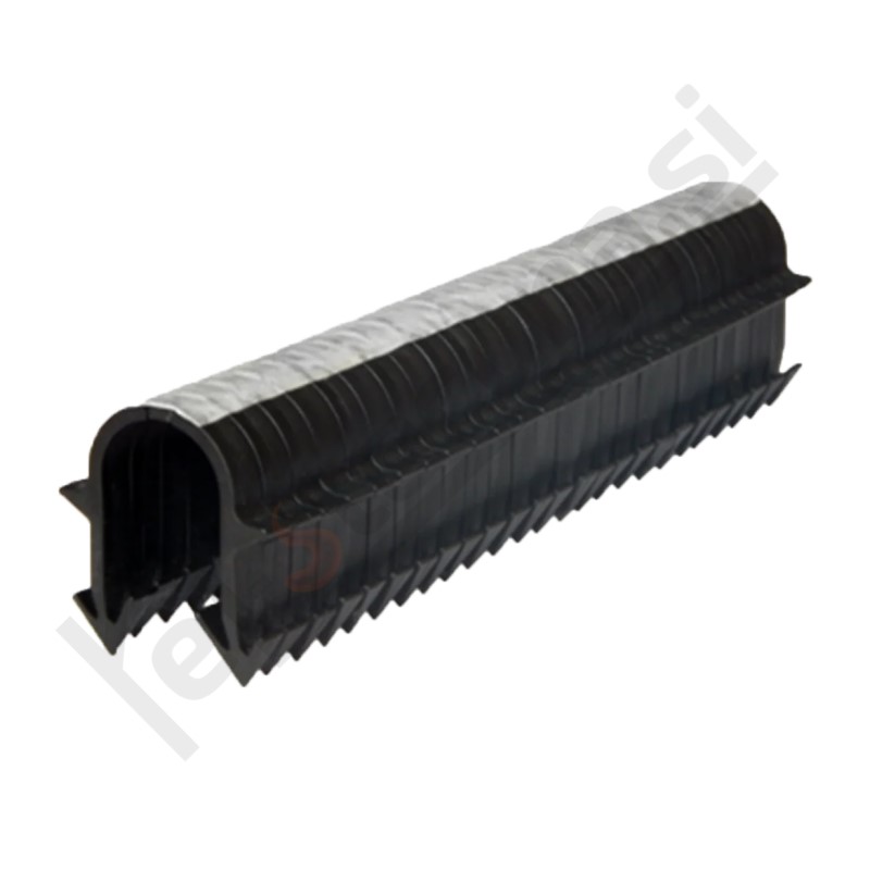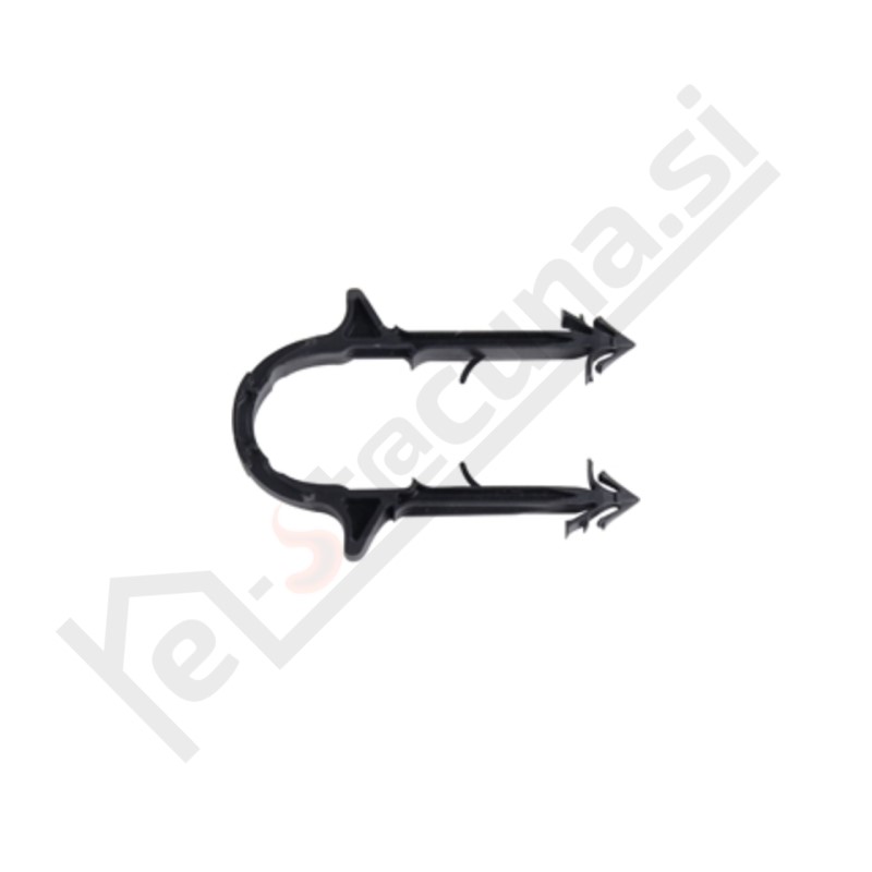 Črna polikarbonatna sponka z harpunama in površinsko zarezo za popoln oprijem sponke v izolaciji in boljšo odpornostjo na trganje.